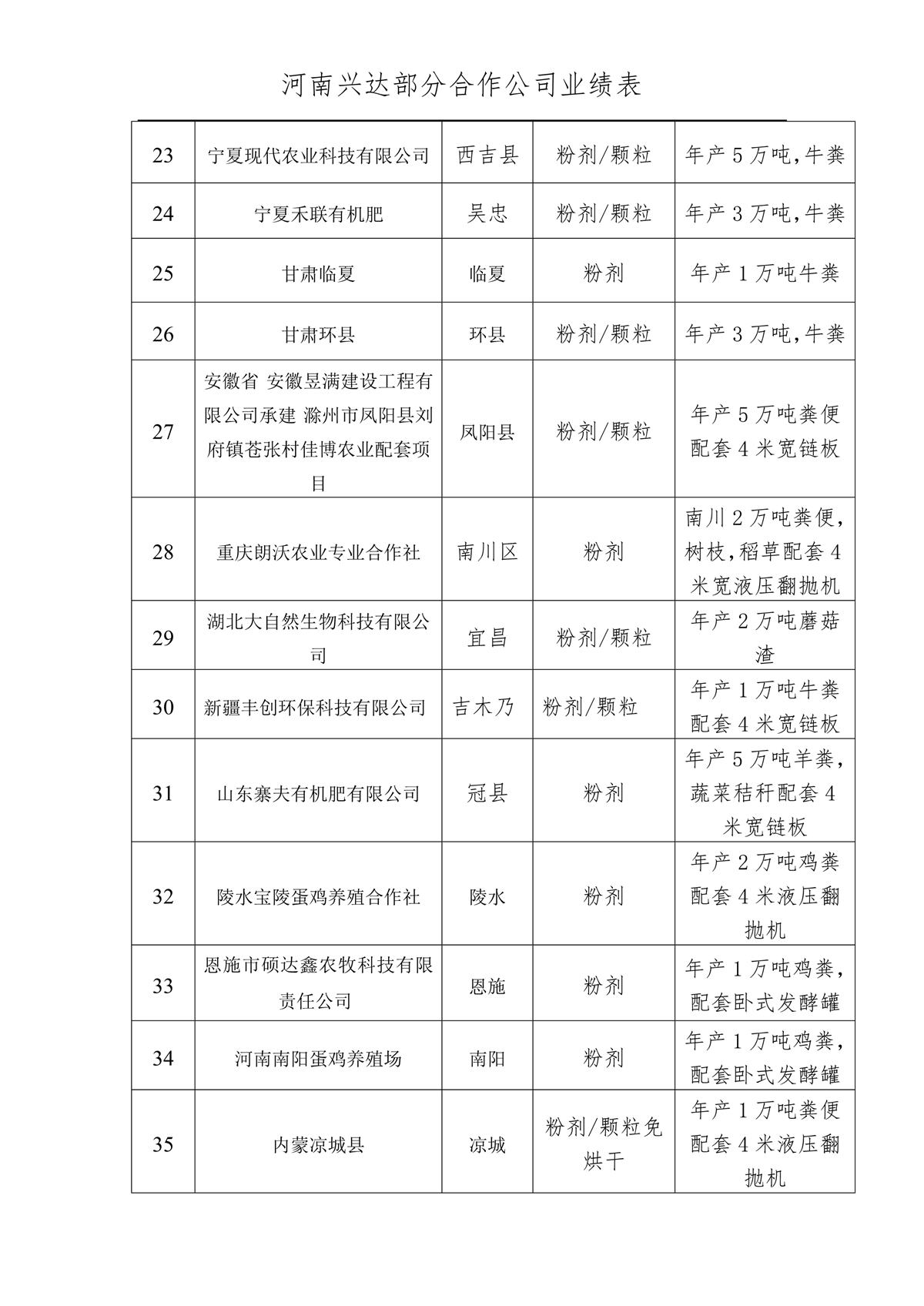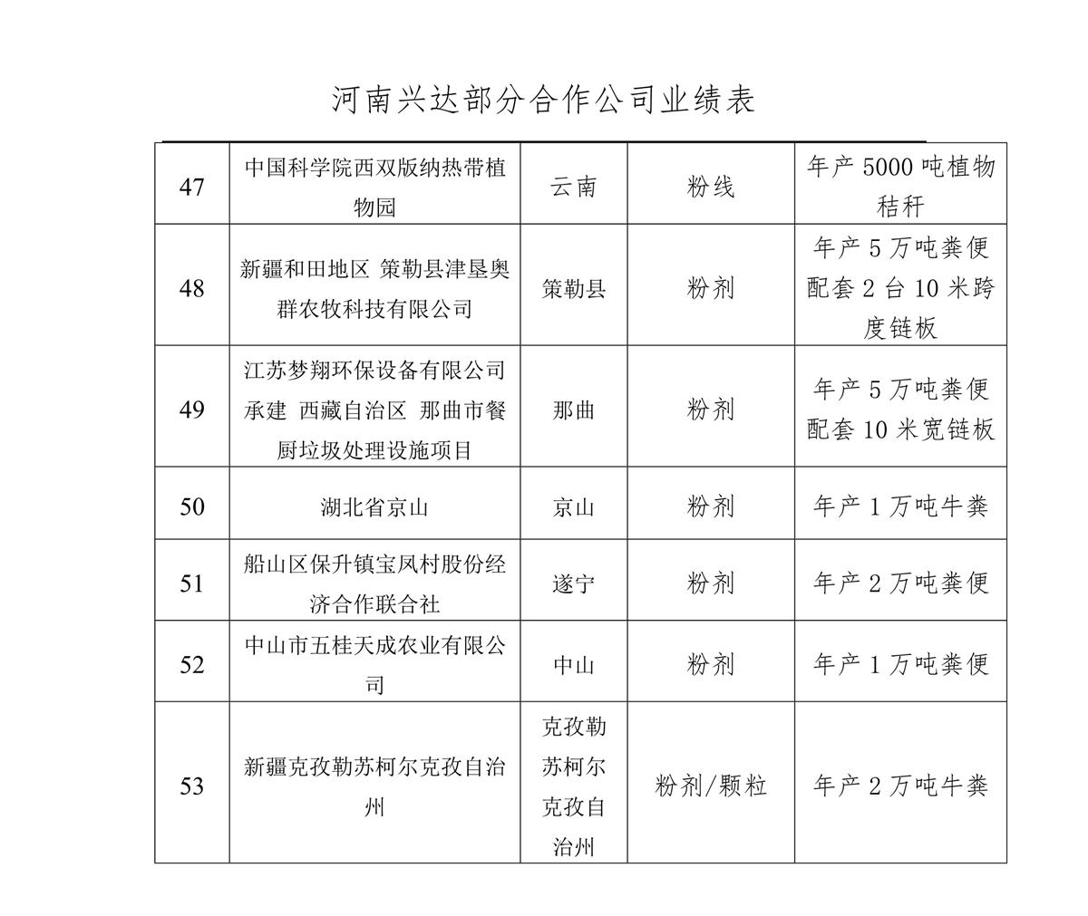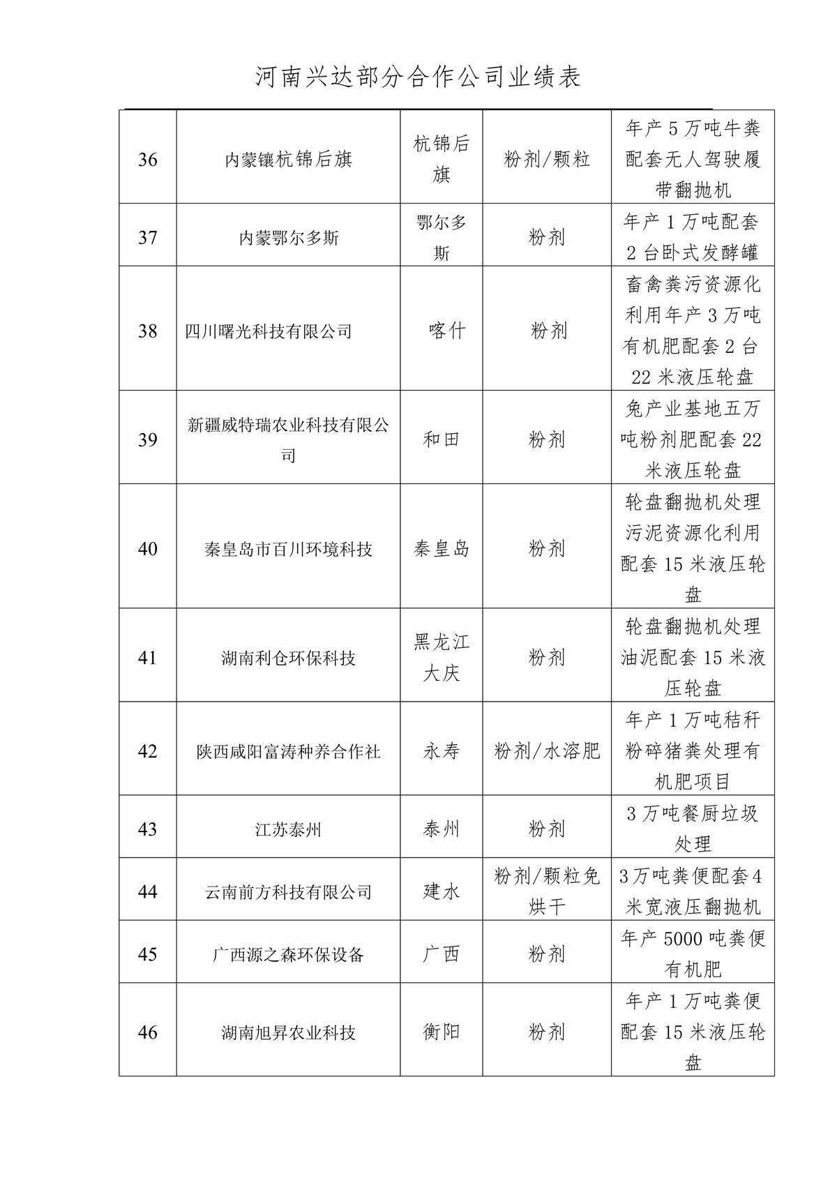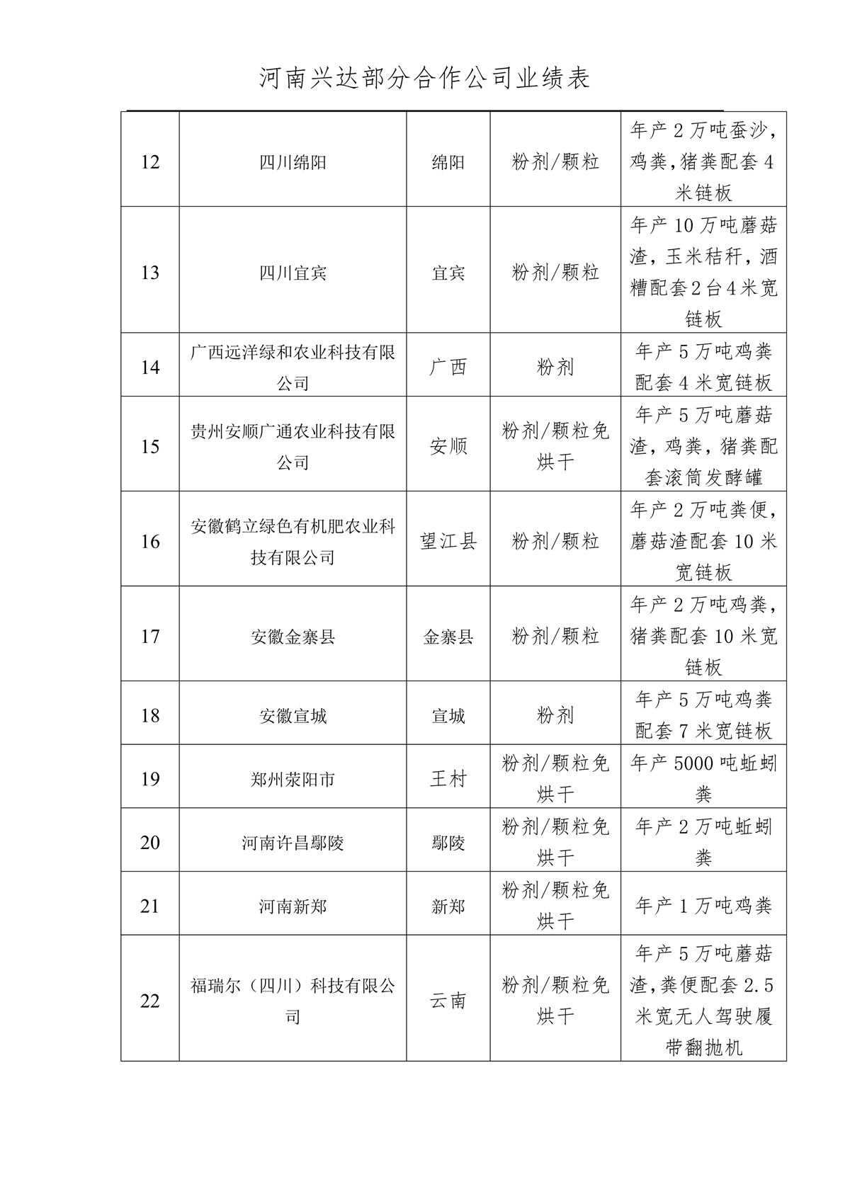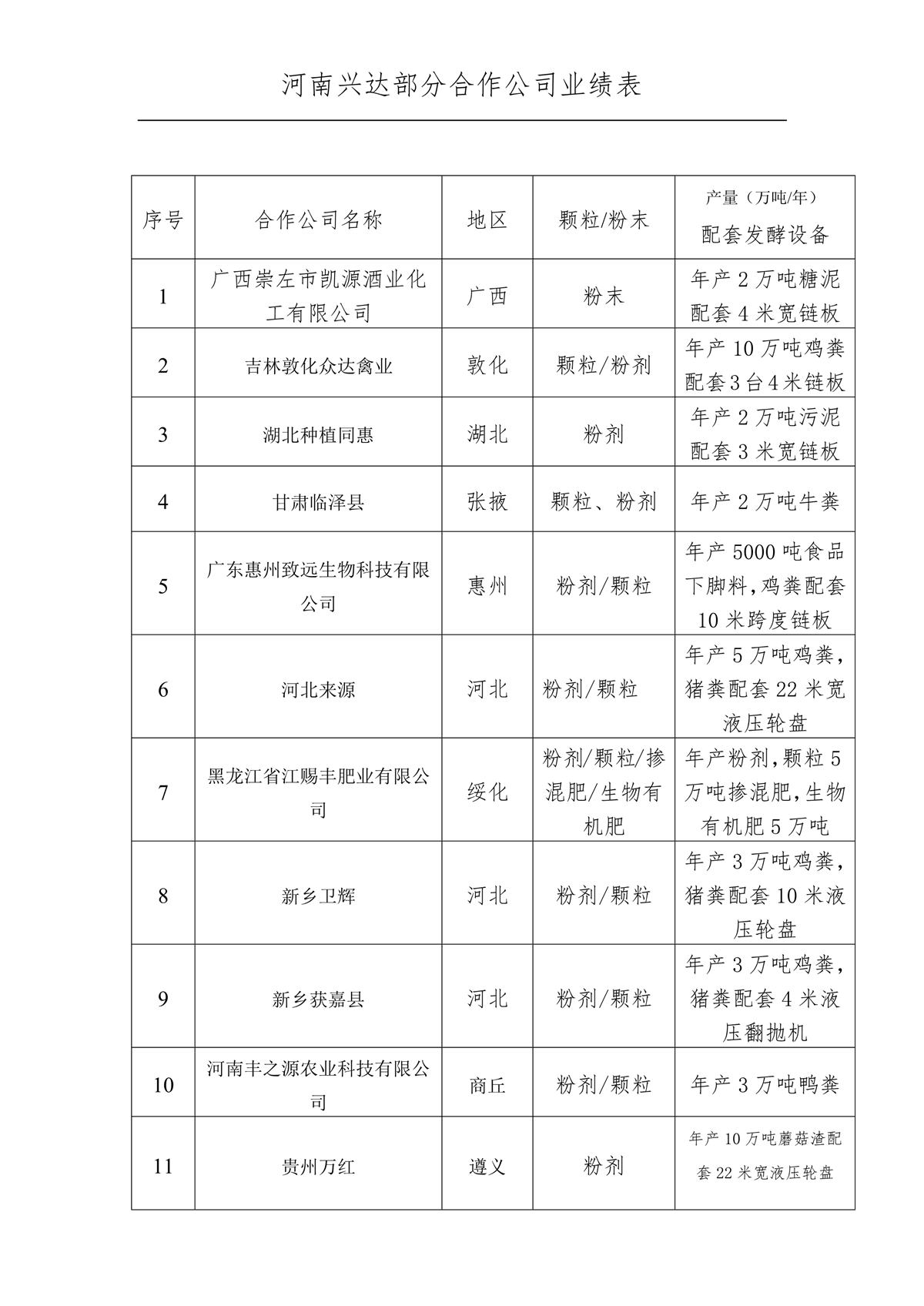 河南興達近期部分合作公司業(yè)績表, 廣西崇左市凱源酒業(yè)化工有限公司,吉林敦化眾達禽業(yè),湖北種植同惠,廣東惠州致遠生物科技有限公司,黑龍江省江賜豐肥業(yè)有限公司等,以上客戶現(xiàn)場可以隨時參觀考察!