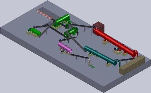 (3)生產(chǎn)系統(tǒng):在這個(gè)系統(tǒng)中,多倉(cāng)自動(dòng)計(jì)量配料系統(tǒng)將發(fā)酵后物料及營(yíng)養(yǎng)元素按所需配方比例均勻出料相互疊加在輸送機(jī)上,使得有機(jī)肥料中的各類指標(biāo)符合國(guó)家生物有機(jī)肥和有機(jī)肥的標(biāo),經(jīng)混合機(jī)攪拌混合均勻后,經(jīng)分料機(jī)分成兩路輸出:一路輸送至粉末包裝機(jī)進(jìn)行粉末肥的包裝成袋;一路輸送至擠壓造粒系統(tǒng)進(jìn)行勻速下料造粒,造好的顆粒經(jīng)逆流式冷卻系統(tǒng)后,篩分進(jìn)行物料冷卻和篩分出返料粉末,待冷卻后的顆粒進(jìn)入包膜機(jī)后顆粒包裝機(jī)包裝,包裝成品由機(jī)器人碼垛系統(tǒng)實(shí)現(xiàn)自動(dòng)化入庫(kù);實(shí)現(xiàn)有機(jī)廢棄物轉(zhuǎn)化成生產(chǎn)高附加值的商品有機(jī)肥,實(shí)現(xiàn)資源循環(huán)利用化、環(huán)境友好化。